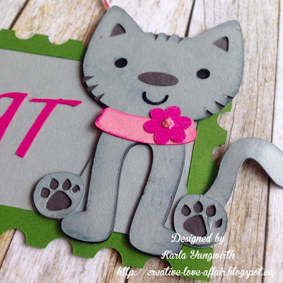 Even though this cute cat comes with a hat and scarf, you can choose to cut her without it! I love that you can do it separately. We used part of the scarf for the collar and duplicated the large flower, making it really tiny to fit on the collar. I used some Distress Ink around the edges before layering her together.