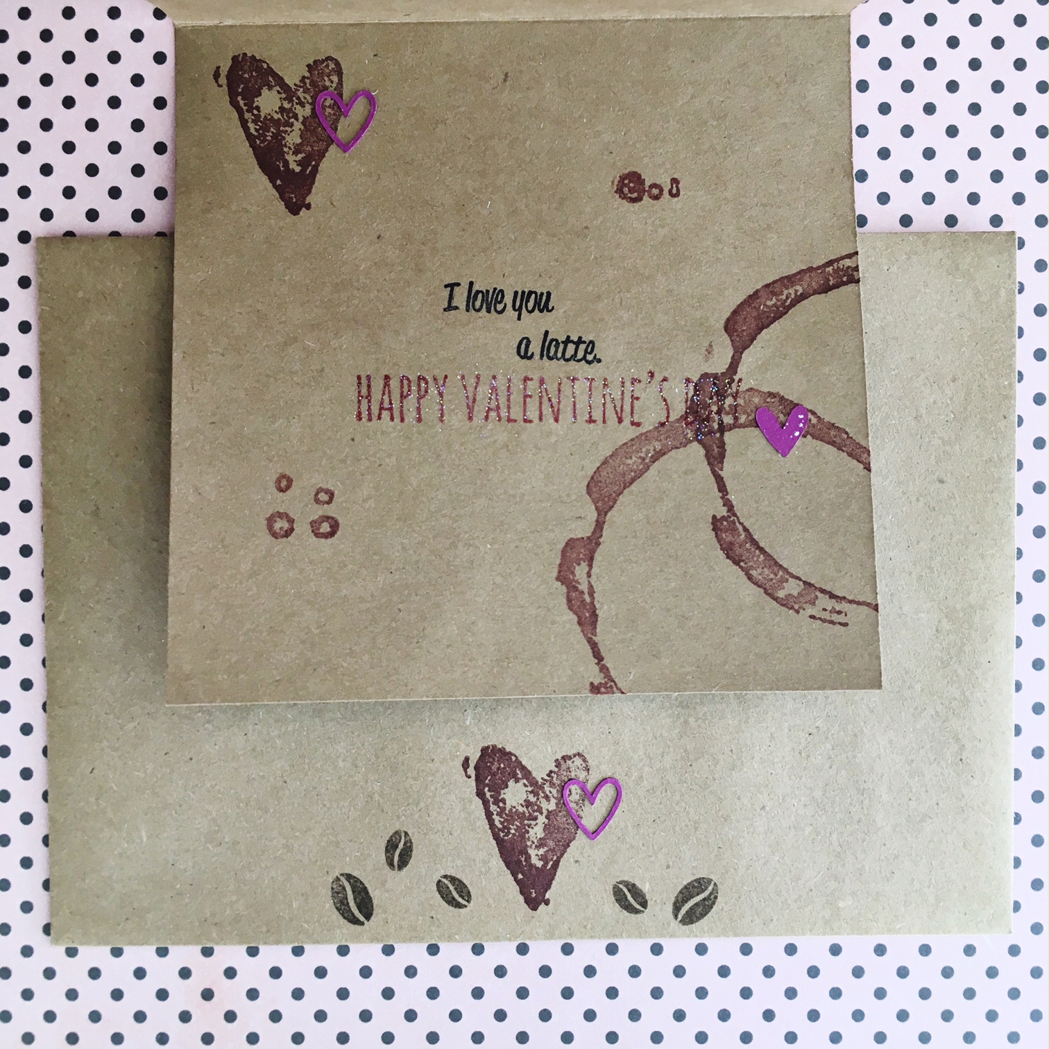 Inside, I added some extra coffee stain stamps and the I Love You A Latte sentiment from the PCS Coffee Sentiments set. The Happy Valentines Day stamp is from the Tim Holtz Crazy Talk set, and I decorated the envelope to match.