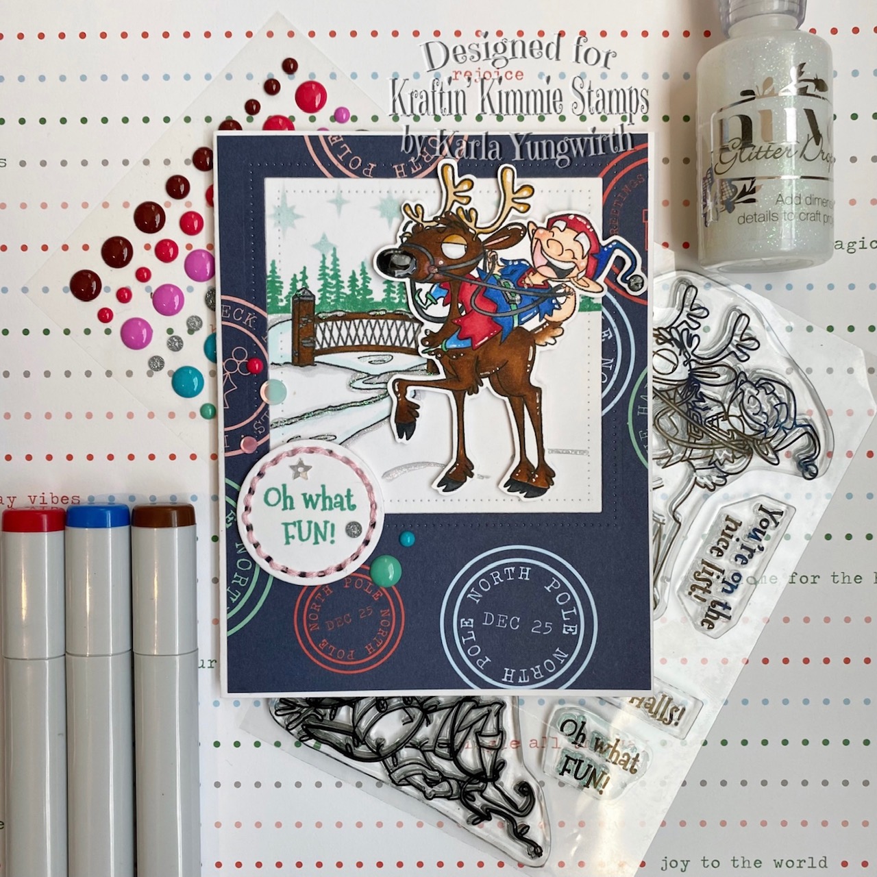 And NOW we are thrilled to introduce a Krafty Komeback set! In case you are new to Kraftin' Kimmie Stamps, we have been creating whimsical krafty stamp sets for almost ELEVEN YEARS! So we have lots of incredible designs that have long retired and once in a while we bring one back for you! Today we are bringing back two holiday images that were originally released in 2012!! It's just in time for those Christmas creations! These images were only ever released in rubber and NOW you can get them as a set in clear photopolymer!! It's called.....BELIEVE IN YOUR ELF! This incredibly fun stamp set will be available in the Krafty Shop at 10am ET this morning, Saturday October 31st!
